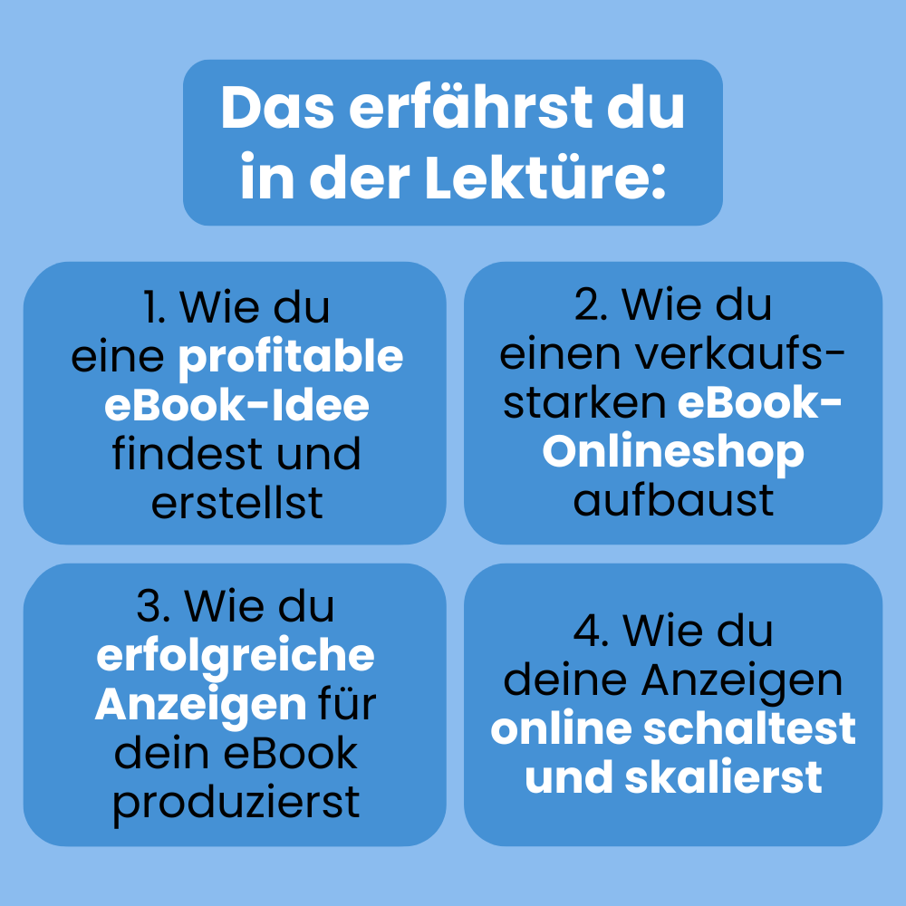 - Wie du deine eBook-Anzeigen online schaltest und skalierst: Testingstrategien, Skalierungsstrategien und Methoden, um auf deinen erfolgreichen Werbeanzeigen aufzubauen und deine Profite exponentiell zu steigern.